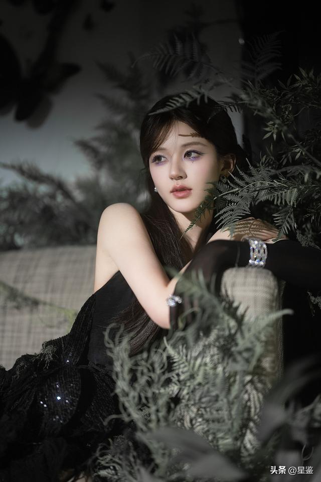 发型也很有巧思,半扎马尾配上侧边的黑色蝴蝶结发饰,既保留了少女感,又和整体暗黑风格呼应,眼尾那点碎钻亮片更是点睛之笔,让清冷的妆容多了一丝破碎感,难怪被网友称为“从暗夜里走出来的玫瑰”。