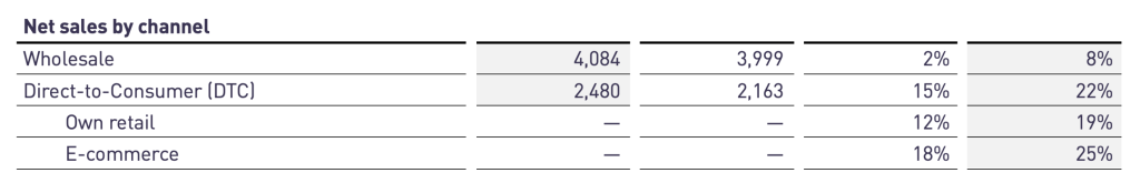 分渠道来看,阿迪达斯一季度批发渠道销售额同比增8%;全球范围内的自营渠道(DTC)同比增长22%,其中电商增长25%、自营门店增长19%。