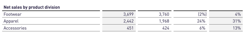 具体来看一季度不同业务的业绩。财报显示,一季度阿迪达斯所有产品部门均实现增长。鞋类收入在去年同期超两成的增长基础上,按固定汇率计算增长4%。财报指出,尽管公司在促销市场中持续专注于全价销售,但鞋类收入依然保持增长,产品阵容推动了多个性能鞋类类别的两位数增长,其中跑步和训练鞋类增长最为显著,同时许多休闲鞋类也实现了两位数增长。